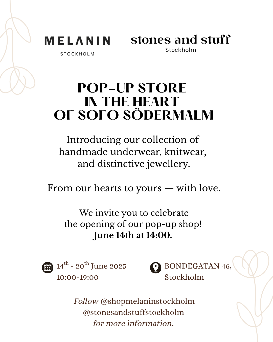 Stones and Stuff Stockholm and Melanin Stockholm join power again and we open a pop-up shop in Södermalm in June. Check the link with fb event and come!
