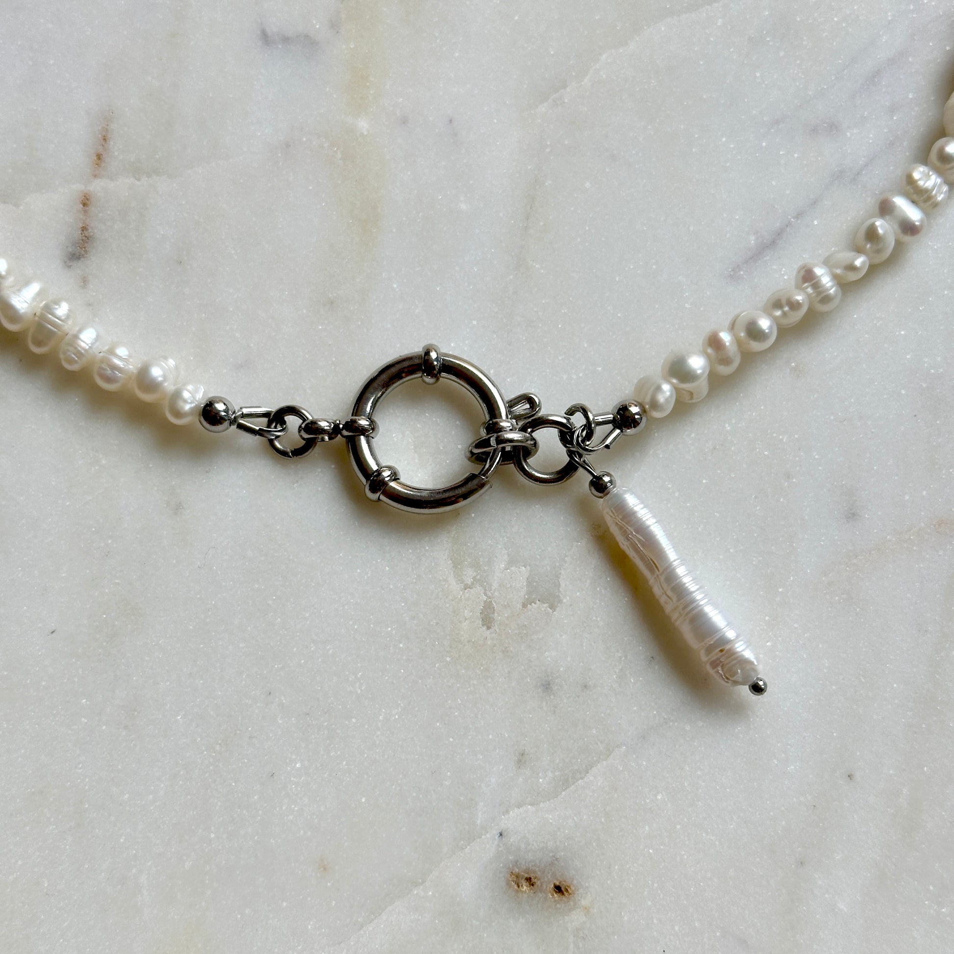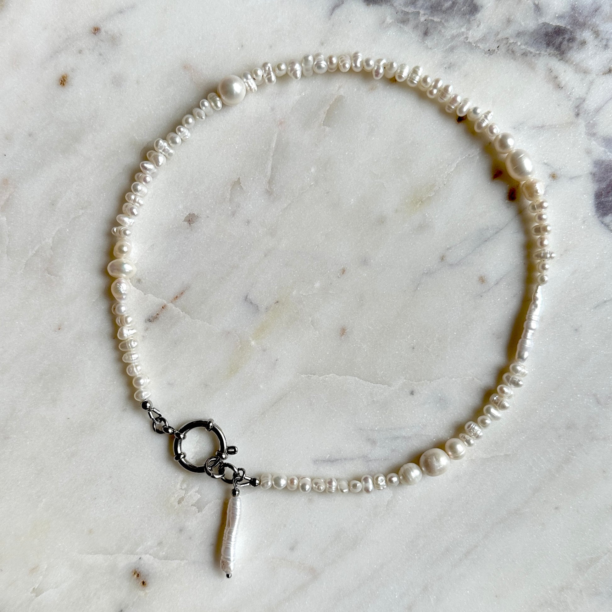 Anna-Clara Necklace features gorgeous, three types of genuine and unique pearls arranged in an unusual design. Each necklace is one-of-a-kind, showcasing pearls with excellent lustre and quality.