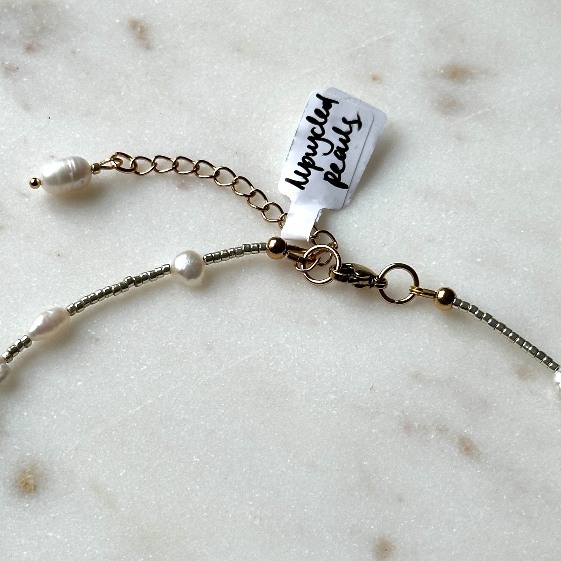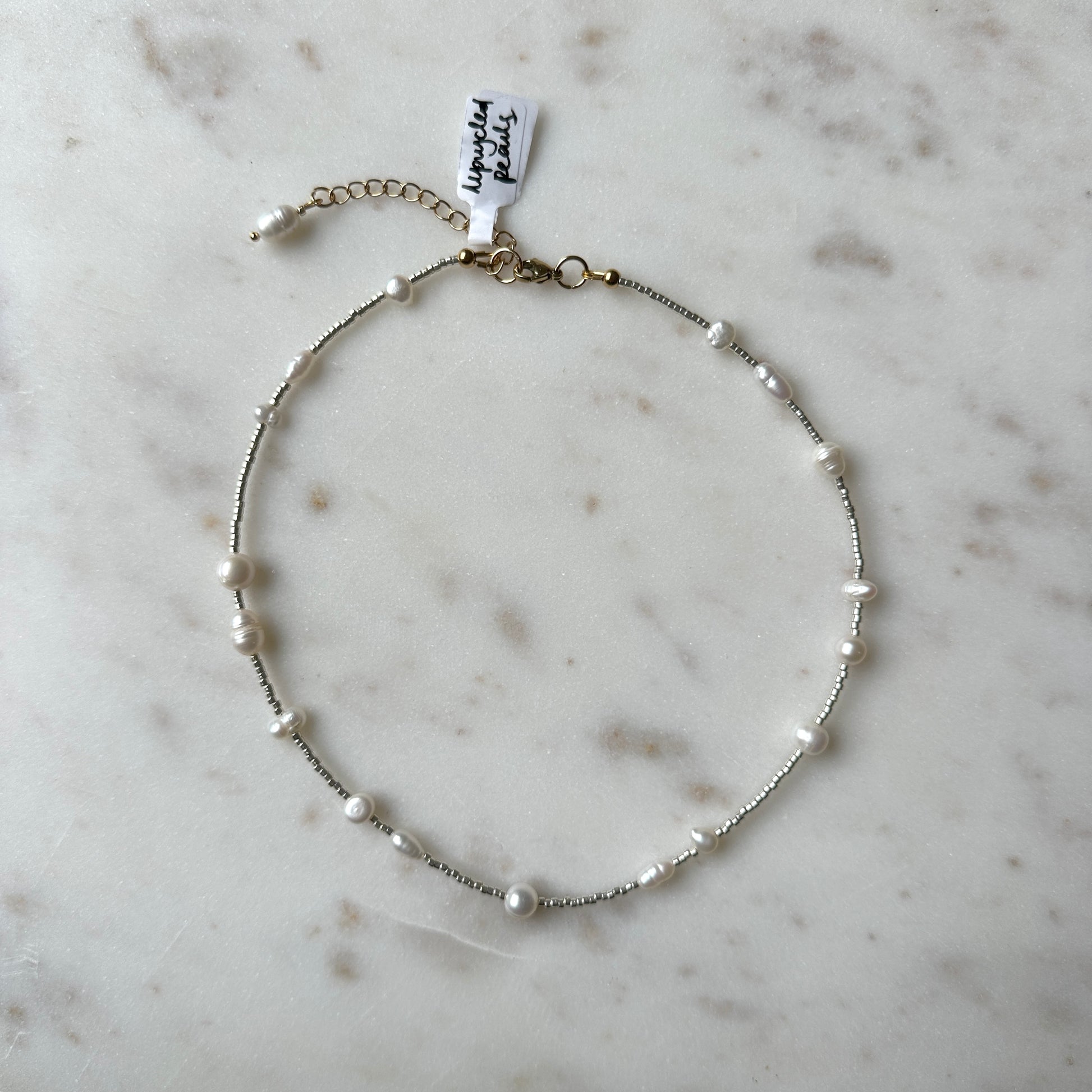 The necklace contains freshwater and saltwater pearls. Most of the pearls are upcycled - retrieved from vintage jewellery and used to make this necklace. Every necklace has a unique pearl setting and is one-of-a-kind.
