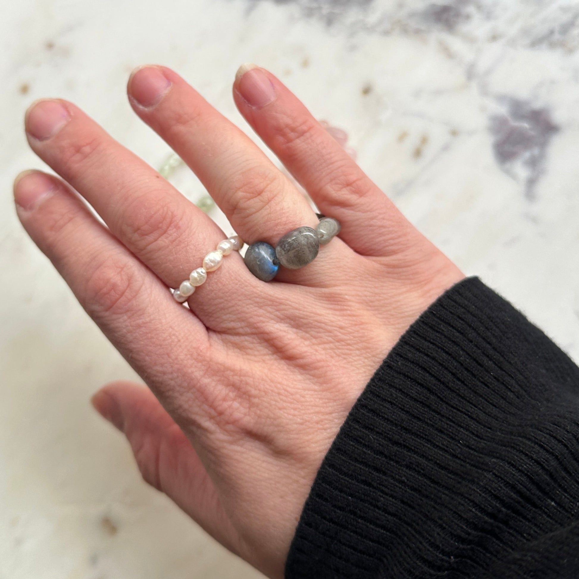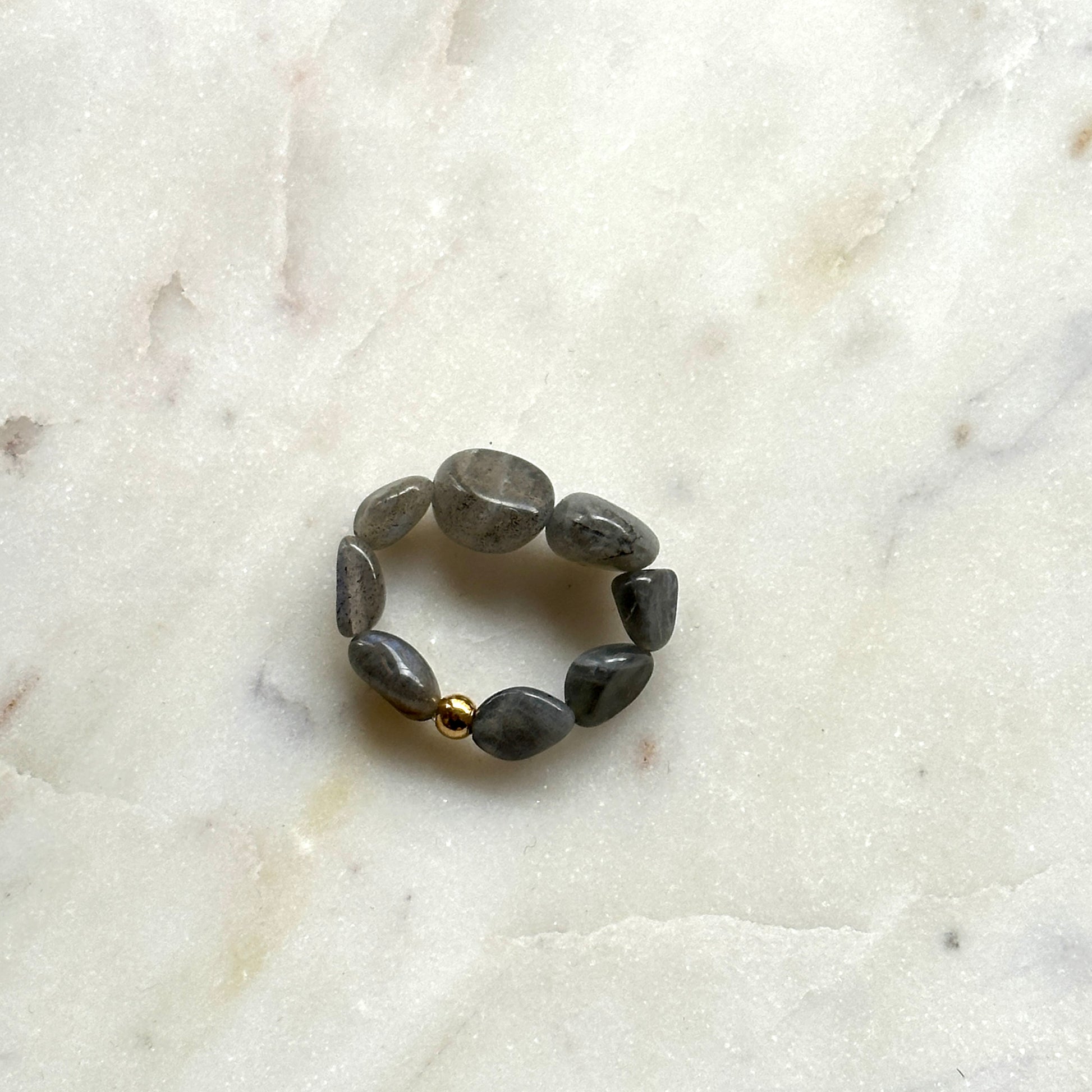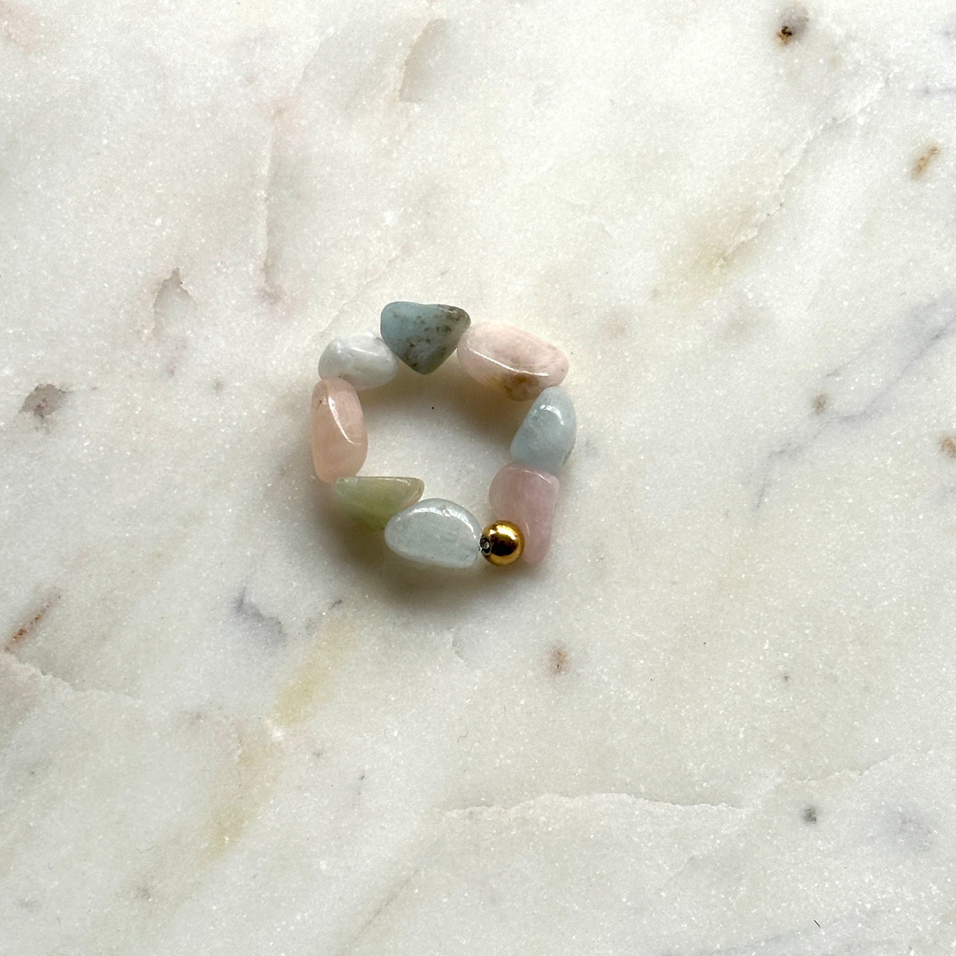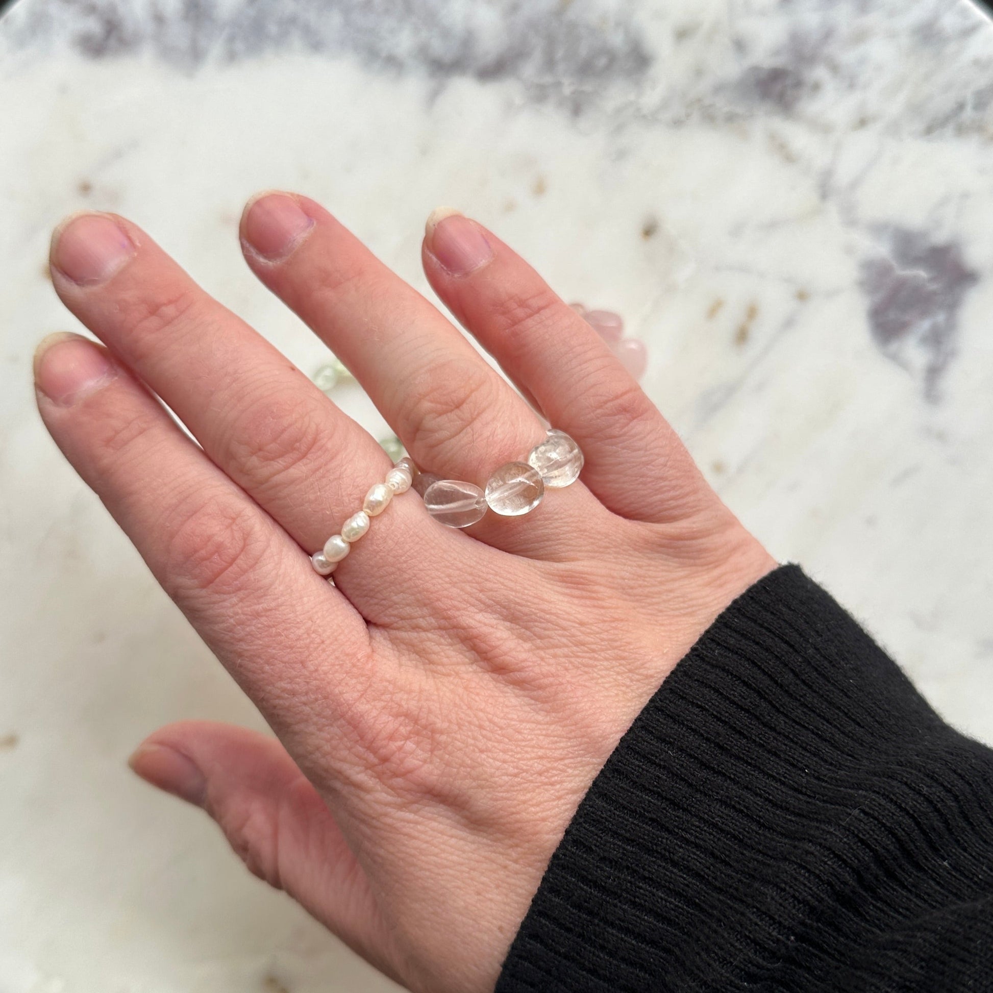 Elisabeth Ring is made of crystal nuggets. Nuggets are unevenly carved and polished chunks of stone or crystals.