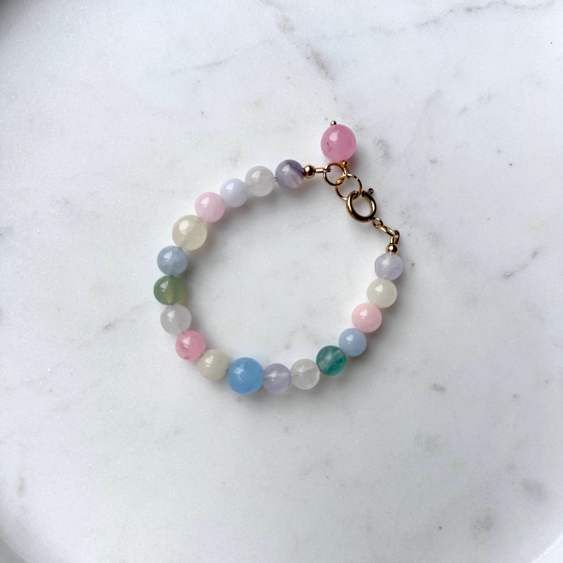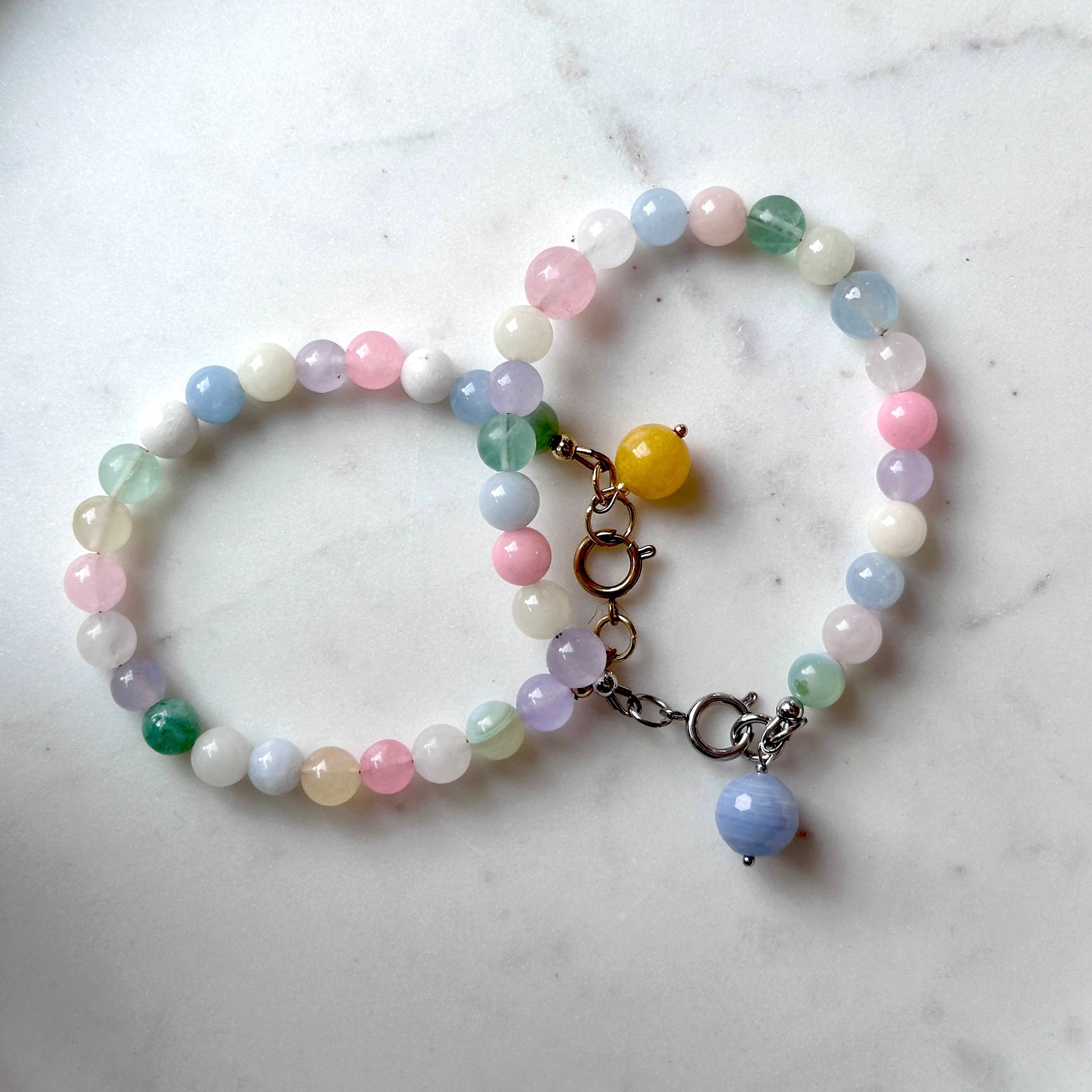 The bracelet is made of jades, crystal, rose quartz, agates, fluorite, aqua amazonite, and calcite. Some stones are bigger than others, and every bracelet is finished with a hanging bigger stone.