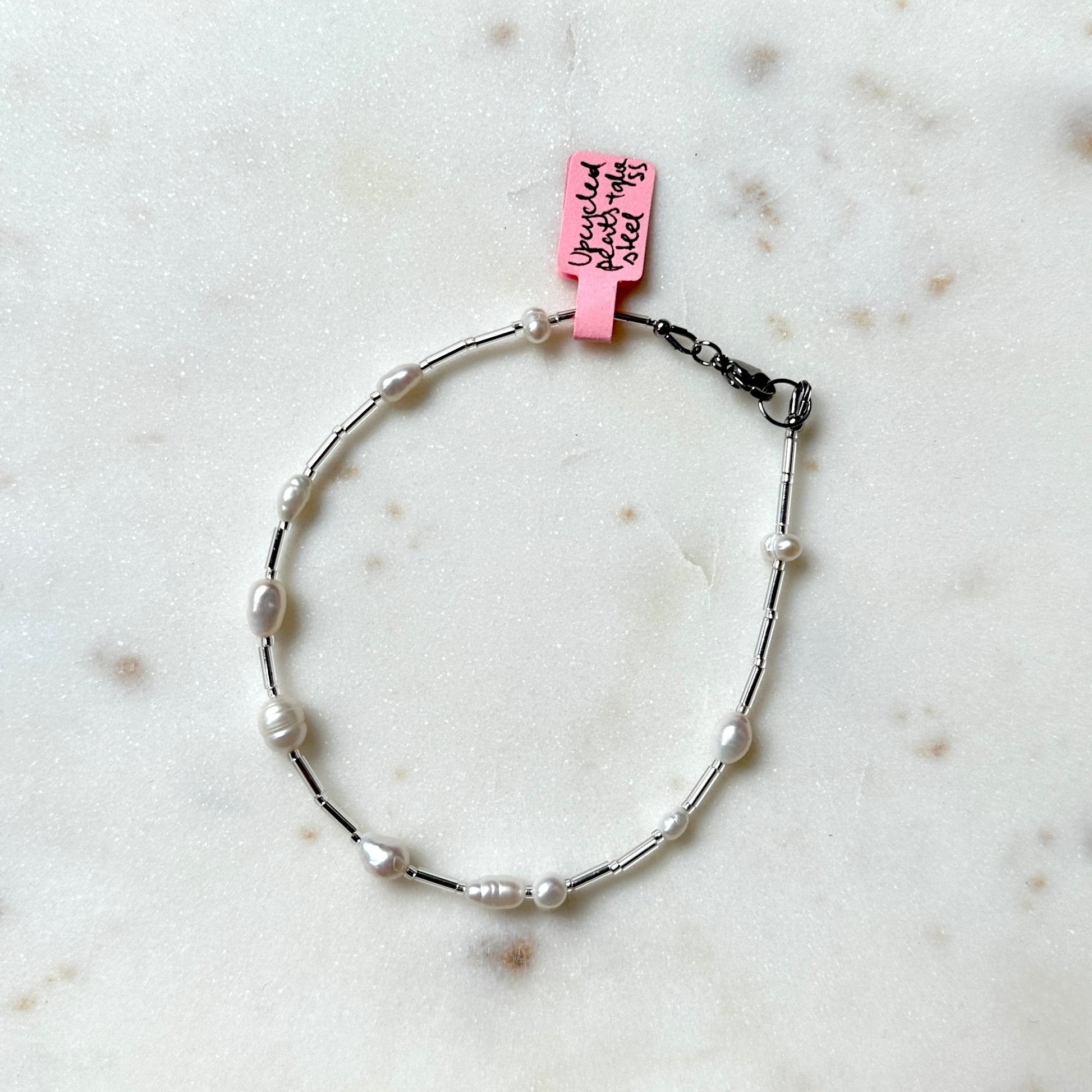 Noheli Anklet features upcycled button and round cultured pearls with high-quality glass beads. They're arranged unevenly on a stainless steel wire.