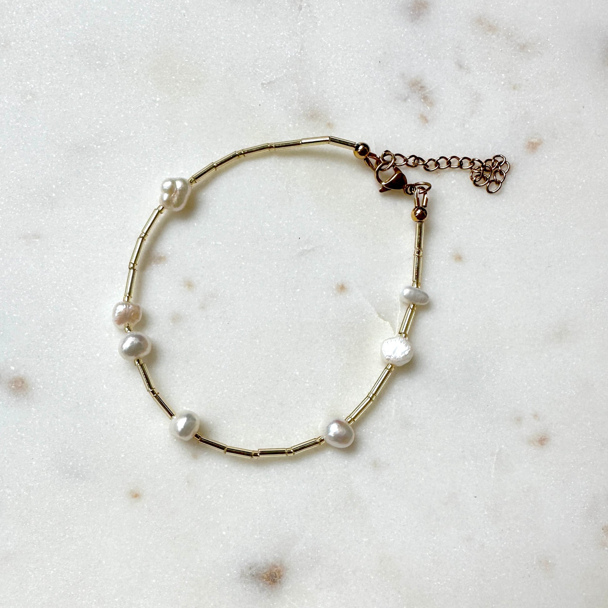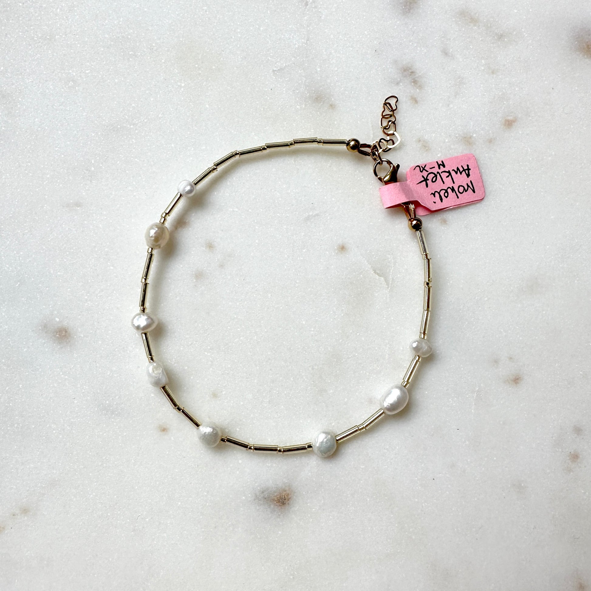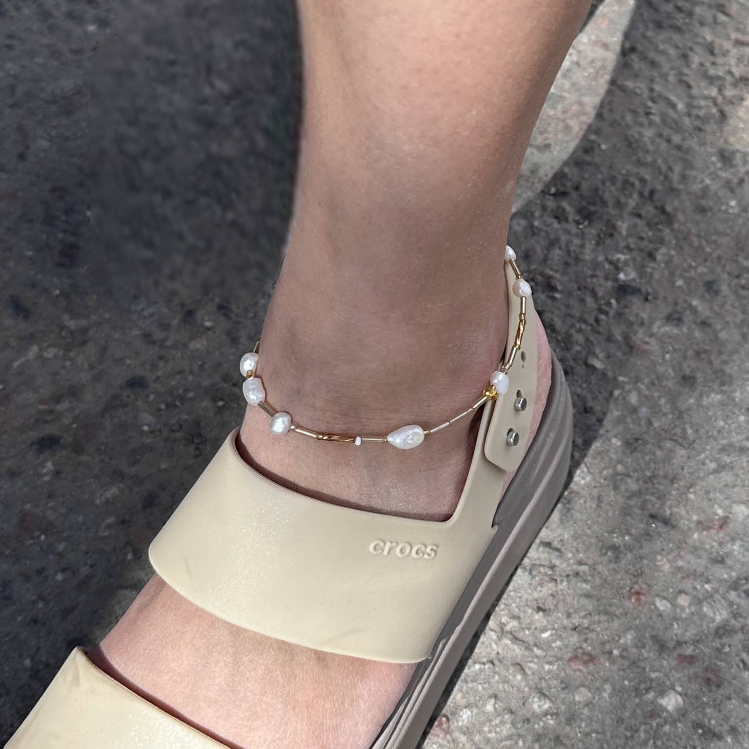— You can't swim or bathe in the anklet. The pearls and glass beads will deteriorate when exposed to water.